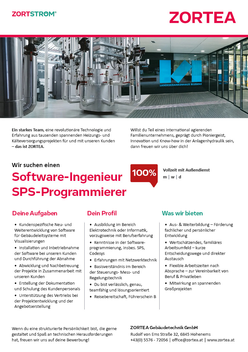 DU programmierst Software für Gebäudeleitsysteme sowie Visualisierungen, übernimmst die Installation und Inbetriebnahme der Software bei unsren Kunden sowie führst die Abnahme durch, wickelst und betreust die Projekte in Zusammenarbeit mit unseren Kunden. Die Unterstützung des Vertriebs bei der Projektentwicklung und der Angebotserstellung zählen ebenfalls zu deinen Aufgaben.